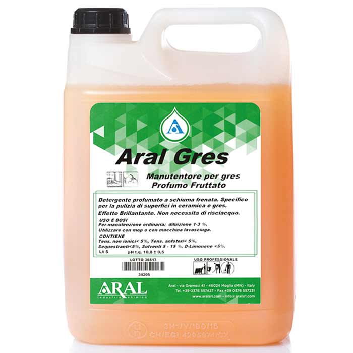 Se cerchi un lavapavimenti per gres efficace, professionale e conforme agli standard HACCP, ARAL GRES è la soluzione ideale. Realizzato da Aral s.r.l., azienda italiana con oltre 20 anni di esperienza nella detergenza professionale, questo prodotto è un detergente concentrato a bassa schiuma e a base solvente, specificamente studiato per la pulizia del gres e delle superfici ceramiche.