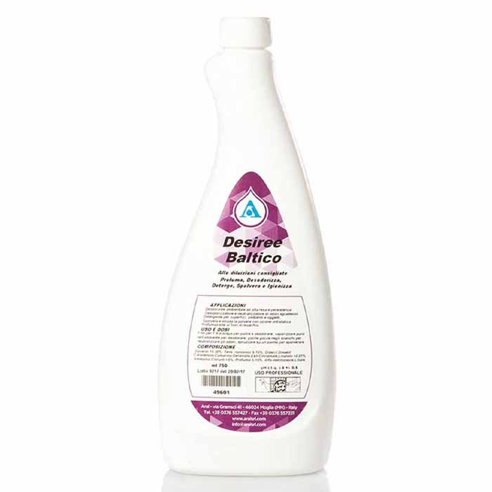 Disponibile in confezione da 6 spruzzini da 750 ml, Desiree Baltico è perfetto per uso domestico e professionale, garantendo igiene e freschezza in ogni ambiente.