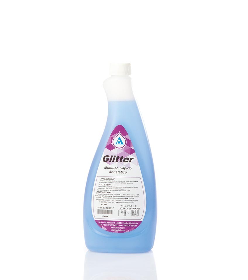 GLITTER è un pulitore multiuso profumato pronto all’uso particolarmente indicato per la pulizia di superfici laccate, smaltate e in laminato plastico.