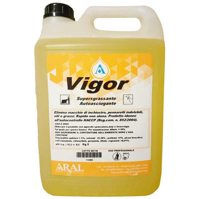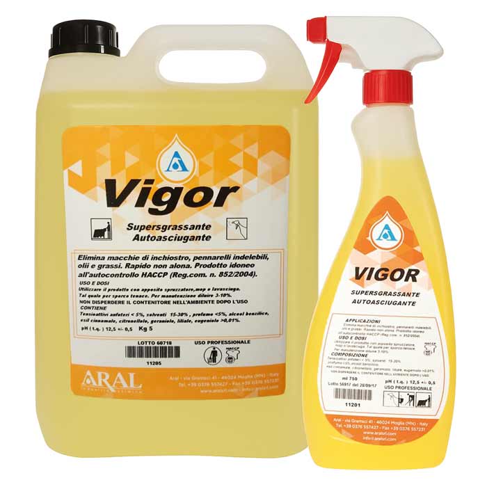 Il sgrassatore professionale HACCP “VIGOR” della ARAL Srl è la scelta ideale per chi opera nel settore industriale o alimentare e necessita di un detergente ad azione rapida e efficace. Questo prodotto è un supersgrassante autoasciugante progettato per eliminare con facilità macchie ostinate di inchiostro, pennarelli indelebili, grafite, oli e grassi su tutte le superfici lavabili.